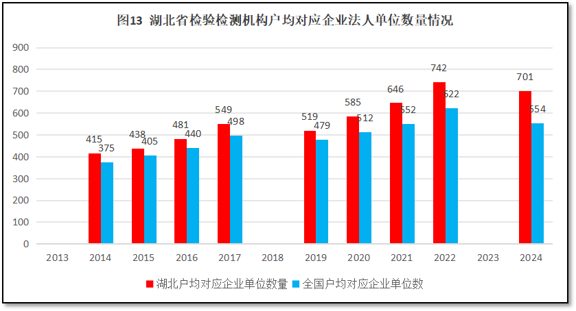 由图13可见,12年来,湖北省检验检测机构户均对应的企业法人单位数量逐年增加(2024年度数据因统计口径差异出现下调),且一直比全国平均数高。2024年湖北省检验检测机构户均对应企业法人单位701个,比全国平均数554个高出147个。以2024年度的统计数据计,湖北地区企业法人单位数量126.9万个,位居全国第7位(较2023年度排名提升3位),排名居于全国前列。这说明,对于湖北省较大的企业法人单位数量来说,湖北地区检验检测机构存量相对合理,检验检测市场空间大,预期竞争烈度有限,检验检测机构的发展机会较多。